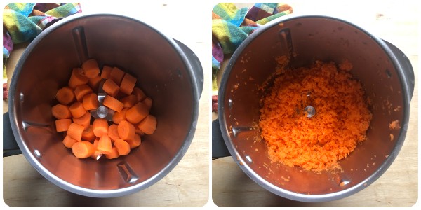 In eine Küchenmaschine geben und fein zerkleinern. Bei Verwendung des Bimby empfehle ich 6 Sekunden auf Stufe 5. Dann öffnen, prüfen und falls die Stücke noch zu grob sind, weitere 2–3 Sekunden bei Stufe 5 zerkleinern. Die Karotten dürfen nicht cremig werden, sie sollten sich noch als sehr kleine Stückchen anfühlen. Andernfalls würden sie zu viel Wasser freisetzen und die Struktur des Kuchens verändern. Keine Sorge: Beim Backen werden sie weich und verschwinden beim Biss, gleichzeitig geben sie dem Kuchen Feuchtigkeit und Leichtigkeit. Falls nach dem Zerkleinern etwas Flüssigkeit am Boden ist, diese abgießen und die Karotten leicht ausdrücken oder in einem Sieb abtropfen lassen. Es reicht, die überschüssige Flüssigkeit zu entfernen, nicht die Karotten komplett zu trocknen.