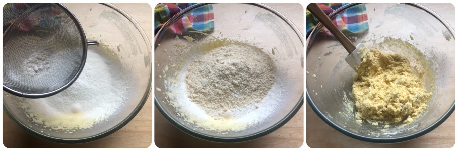 Nun Mehl und Backpulver durch ein feines Sieb sieben, das Mandelmehl ebenfalls hinzufügen und mit einem Spatel unterheben.