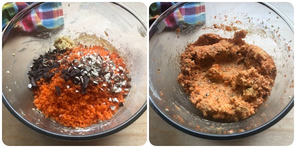 Jetzt die Karotten, 30 g Zartbitterschokolade und 20 g gehackte Mandeln unterheben und so mischen, bis ein fester, aber homogener Teig entsteht.
