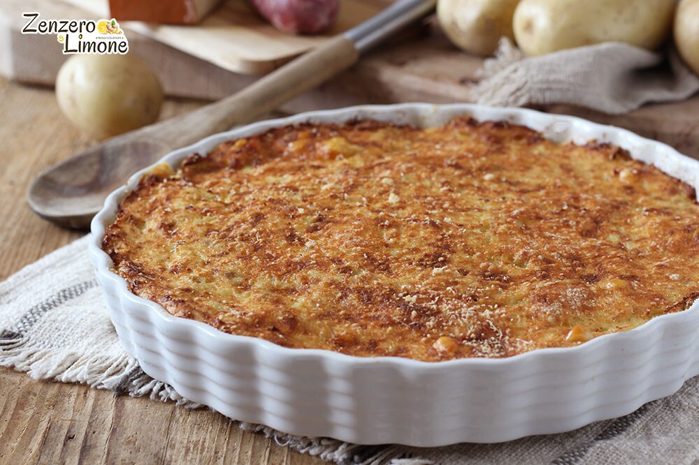 Den Kartoffelauflauf im vorgeheizten statischen Ofen bei 200° 25 Minuten backen, dann zum Grill schalten und die Backzeit um weitere 5 Minuten verlängern oder bis die Oberfläche goldbraun ist.