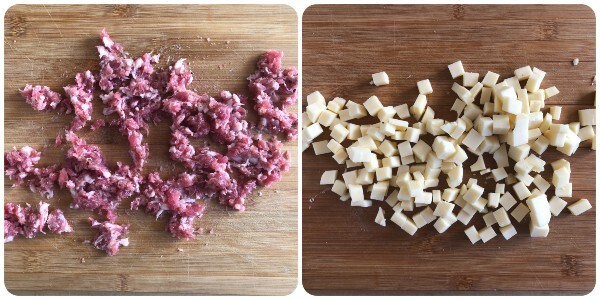 Dann die zerbröselte Bratwurst, die Fontina-Würfel, 40 g geriebenen Käse hinzufügen und gut mischen, um alle Zutaten zu vermengen. Mit Salz und Pfeffer abschmecken.
