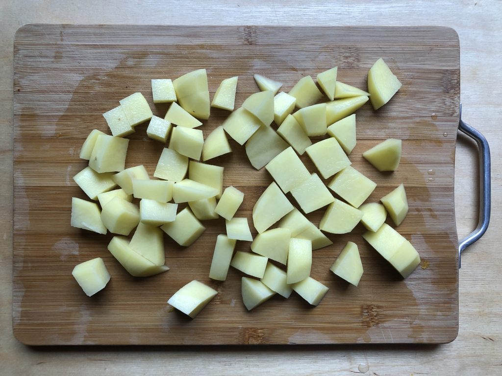 Die Kartoffeln schälen, waschen und in Stücke schneiden, die mehr oder weniger die gleiche Größe wie die Kürbisstücke haben.