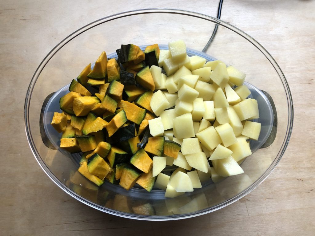Kürbis und Kartoffeln in den Korb eines Dampfgarers legen und 10 Minuten dünsten. Hier ist eine Klarstellung notwendig: Ich habe die Stücke getrennt gehalten, da der Kürbis mit Schale ein paar Minuten mehr Garzeit benötigt. Auf diese Weise konnte ich die Kartoffeln nach den ersten 10 Minuten einfach herausnehmen und die Garzeit des Kürbisses um weitere 3/5 Minuten verlängern.