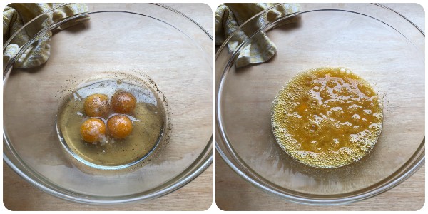 Die Eier in eine zweite Schüssel aufschlagen, nach Belieben salzen und pfeffern und mit einer Gabel so lange verquirlen, bis Eigelb und Eiweiß vermischt sind.
