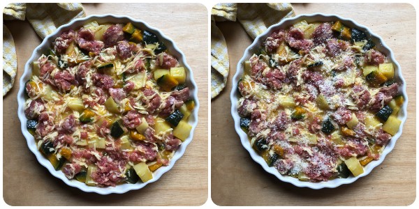 Zubereitung des rustikalen Kürbis-Kartoffel-Auflaufs
