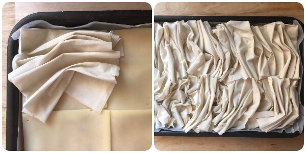Die erste Hälfte auf den mit Backpapier ausgelegten Boden eines 30 x 20 cm großen Backblechs legen und mit etwas Wasser bestreichen. Die zweite Hälfte darauflegen, um den gesamten Boden abzudecken, und ebenfalls bestreichen.
