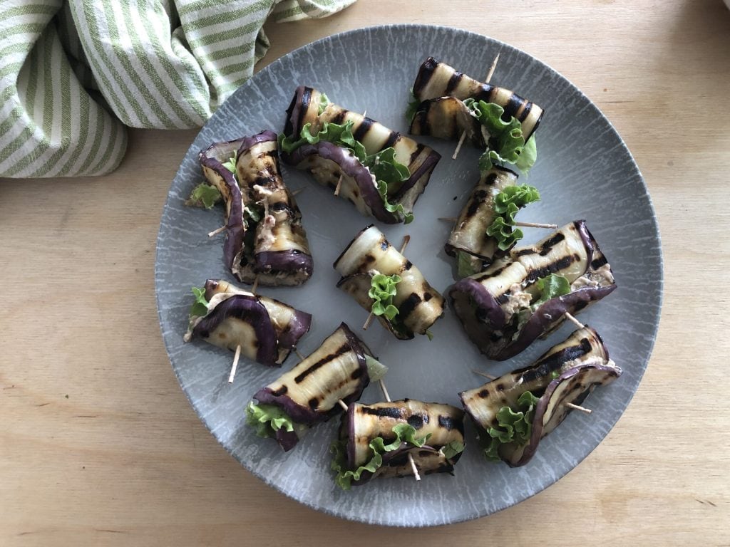 Eine Scheibe gegrillte Aubergine auf ein Schneidebrett legen, etwas Käsecreme darauf verteilen und mit einem kleinen Blatt Kopfsalat oder Eisbergsalat abschließen.