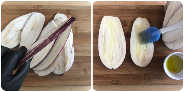 Die Aubergine an den Enden abschneiden, waschen, mit Küchenpapier abtupfen und in Scheiben von 4/5 mm Dicke schneiden (aus einer mittelgroßen Aubergine erhält man etwa 10 Scheiben), dann mit etwas Öl bestreichen.