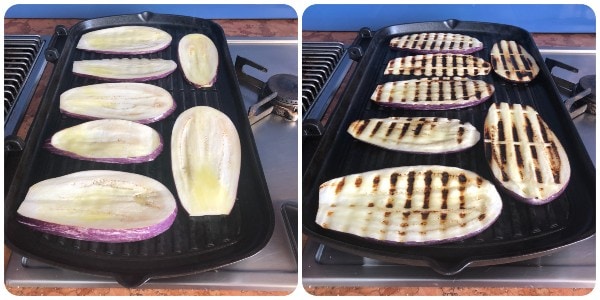 Eine Grillpfanne oder eine geriffelte Platte sehr gut erhitzen und die Auberginen darauf von beiden Seiten grillen.