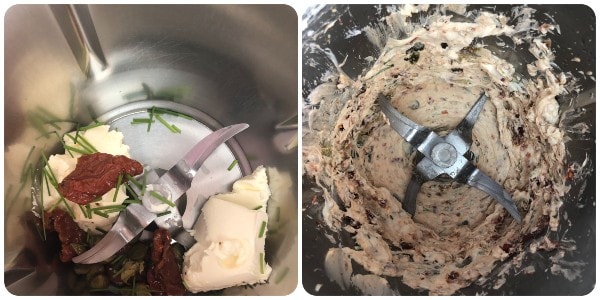 Den Frischkäse, die gut abgetropften getrockneten Tomaten aus dem Konservierungsöl, die entschuppten Kapern und den gehackten Schnittlauch mit einer Schere in einen Mixer geben und alles mehrmals mixen. Ich habe mehrmals bei Geschwindigkeit 5/6 gemixt und die Mischung immer wieder zur Mitte des Mixbehälters geschoben.