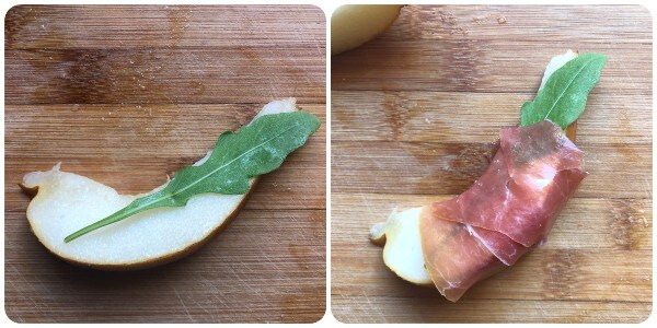• Auf jede Birnenscheibe ein Rucolablatt legen und einen Streifen rohen Schinken herumwickeln.