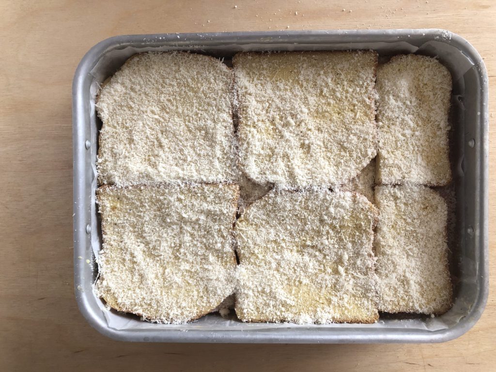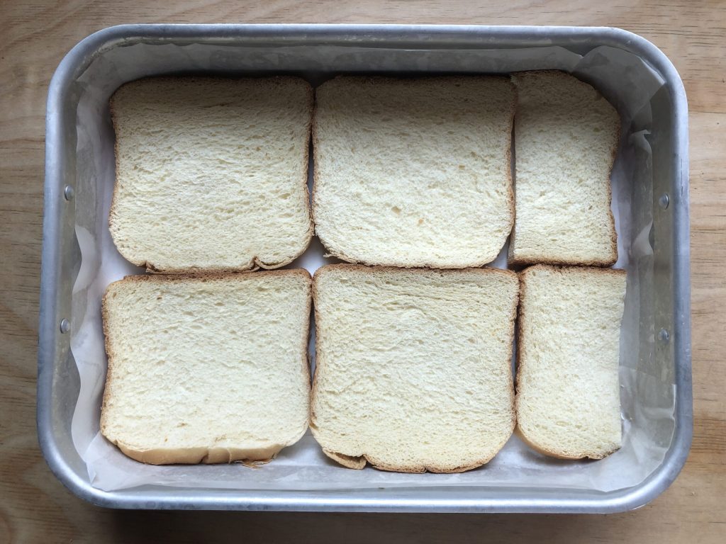 Den Boden und die Ränder einer 30 x 23 cm großen Backform mit Backpapier auslegen. Dann die Brotscheiben auf dem Boden verteilen, bei Bedarf auf die Größe zuschneiden.