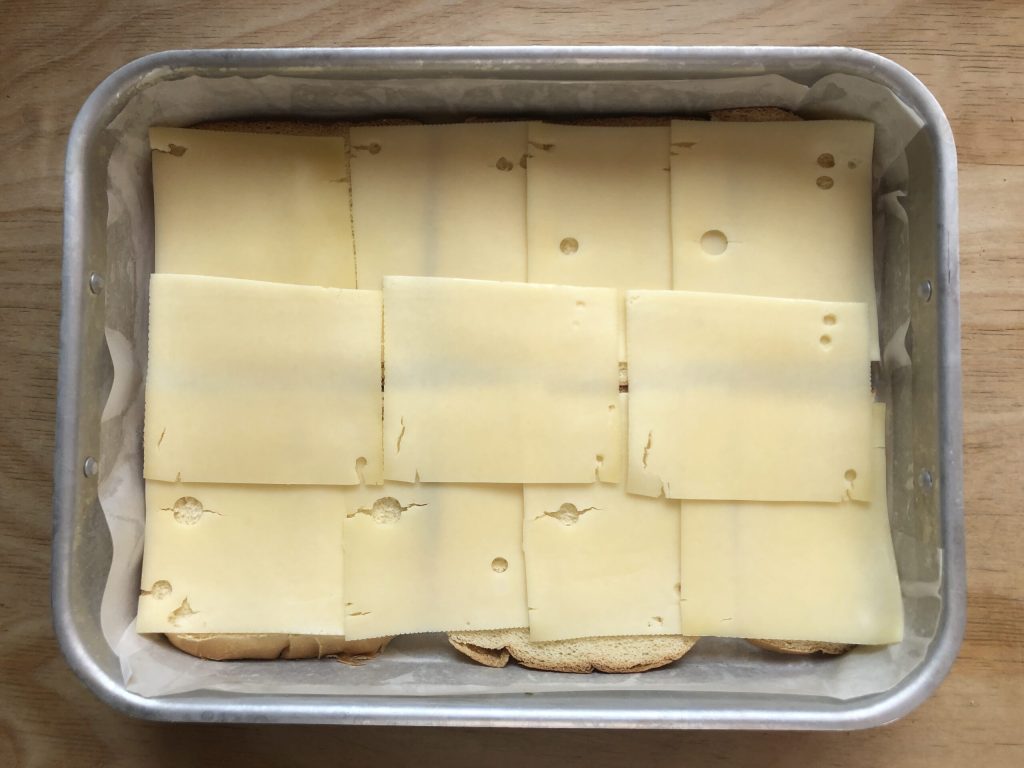 Diese mit den Emmentalerscheiben bedecken: zum Komfort habe ich bereits geschnittenen verwendet. Wenn Sie diesen nicht finden, empfehle ich, die gleiche Menge Emmentaler zu reiben, da es ziemlich schwierig ist, mit einem Messer dünne Scheiben zu erhalten.