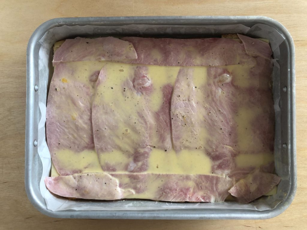 Nun die Schinkenscheiben darauf legen und noch etwas von der Eiermischung darüber gießen.