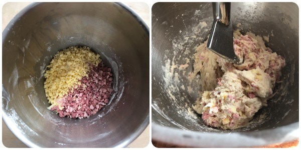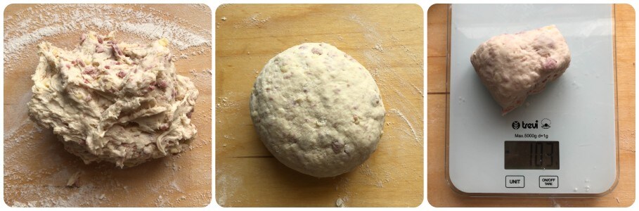 Wenn die Mischung fest geworden ist, auch den gehackten Schinken und Käse hinzufügen und weiter kneten, bis alle Zutaten gut vermischt sind und ein homogener und elastischer Teig entstanden ist.
