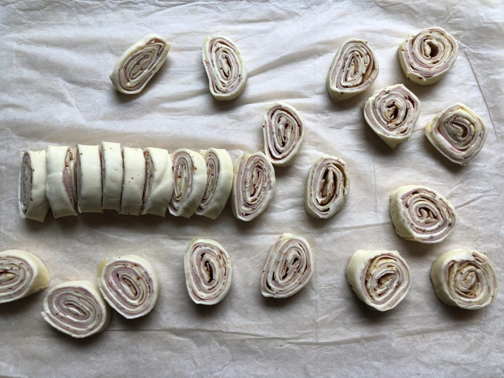 Dann die entstandene Rolle in das Backpapier einwickeln und für etwa eine Stunde in den Kühlschrank legen, damit sie etwas fest wird und die Schnecken leichter zu schneiden sind. Alternativ könnt ihr sie für zwanzig Minuten in den Gefrierschrank geben. Wenn ihr dieses Fingerfood im Voraus vorbereiten wollt, könnt ihr es einen ganzen Tag im Kühlschrank aufbewahren oder einfrieren.