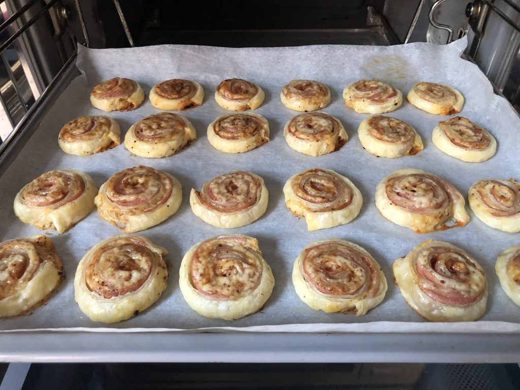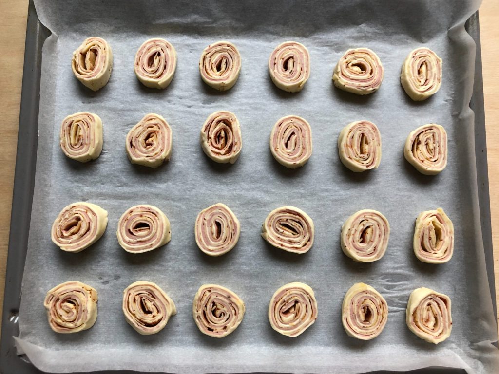 Die Schnecken mit Mortadella und Käse auf das mit Backpapier ausgelegte Backblech legen, wobei sie etwas auseinanderliegen sollten.