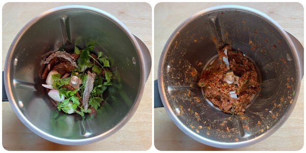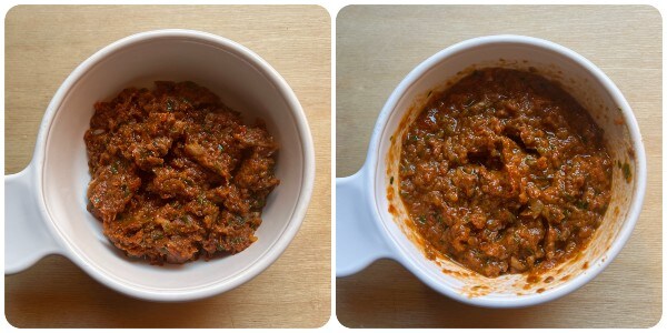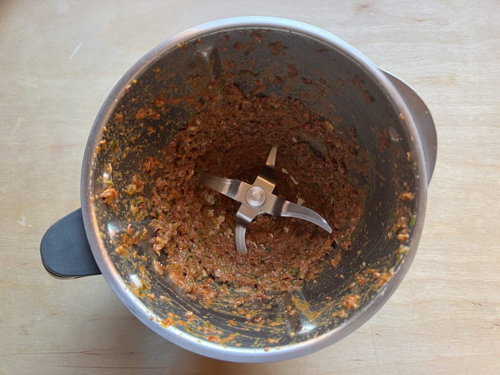 Die getrockneten Tomaten aus dem Öl abtropfen lassen und in einen Mixer geben. Die geschälte und in Ringe geschnittene Schalotte, die Petersilienblätter und die Anchovisfilets hinzufügen und so lange pürieren, bis alle Zutaten zerkleinert sind. Ich habe den Bimby verwendet und dabei nach Gefühl gearbeitet, indem ich die Mischung mehrmals zur Mitte des Bechers hin zusammengeführt habe.