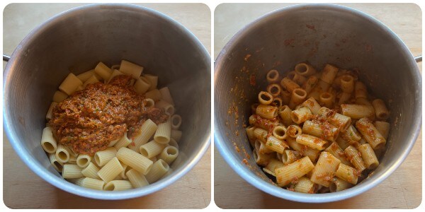 In der Zwischenzeit die Pasta in reichlich gesalzenem kochendem Wasser kochen, al dente abgießen, ohne sie zu trocken abzutropfen, und etwas Kochwasser zurückhalten. Sofort in den noch warmen Topf zurückgeben, die Sauce hinzufügen und umrühren, bis alles gut vermischt ist. Falls nötig, die Sauce weiter verflüssigen, indem Sie ein paar Esslöffel des zurückgehaltenen Wassers hinzufügen.