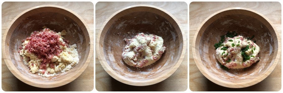 Fügen Sie dann auch den fein gehackten Speck hinzu (ich habe ihn in einen Mixer gegeben) und den mit der Schere geschnittenen Schnittlauch.