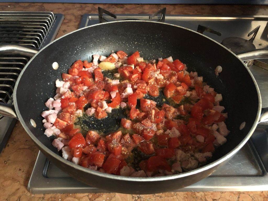 Sobald der Wodka verdunstet ist, die in Stücke geschnittenen Kirschtomaten, eine großzügige Prise Salz und eine ordentliche Portion frisch gemahlenen schwarzen Pfeffer hinzufügen.