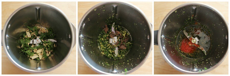 Wenn ihr diese würzigen Spaghetti ohne Thermomix zubereitet, hackt Knoblauch, Petersilie, Pinienkerne und Chili. Erhitzt das Öl in einem Topf und fügt die Sardellenfilets hinzu. Lasst sie schmelzen, indem ihr sie mit dem Rücken eines Löffels zerdrückt, dann gebt die vorbereitete Mischung hinzu und kocht sie einige Minuten. Schließlich das Tomatenfruchtfleisch hinzufügen und einige weitere Minuten weiterkochen. Ansonsten ist das Rezept gleich.