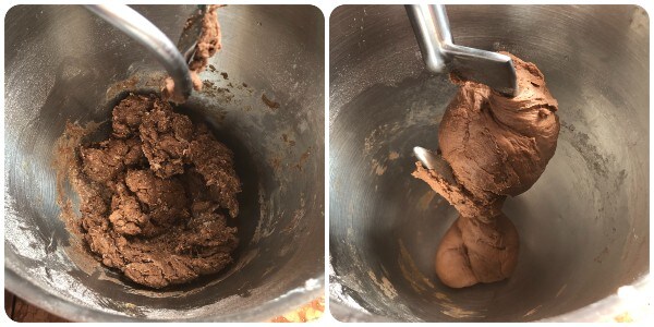 Das Mehl und das ungesüßte Kakaopulver in die Schüssel der Küchenmaschine sieben und durch ein feinmaschiges Sieb geben. Dann die Trockenhefe und den Zucker hinzufügen und mit einem kleinen Handrührbesen vermischen. Wenn ihr frische Hefe verwendet, fügt sie jetzt nicht hinzu, sondern löst sie in der lauwarmen Milch auf, bevor ihr sie zum Mehl gebt.