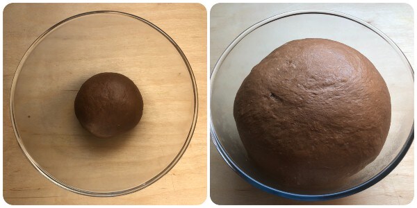 Den Teig auf die Arbeitsfläche geben, kurz mit den Händen bearbeiten und eine Kugel formen. In eine große Schüssel legen, mit Frischhaltefolie abdecken und an einem warmen, zugluftgeschützten Ort gehen lassen, bis das Volumen sich verdoppelt hat. Die Gehzeit hängt von der Umgebungstemperatur ab und kann zwischen 2 und 4 Stunden variieren. Mein Teig war nach 3 Stunden bereit.
