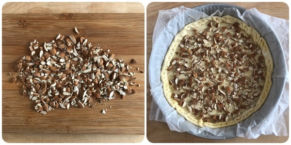 Die Mandeln mit einem Messer grob hacken und sie dann auf dem Boden der Backform verteilen. Anschließend die Blätterteigschale in den Kühlschrank stellen, während die Füllung zubereitet wird.
