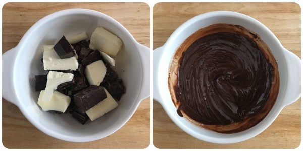 In einer Schüssel die Zartbitterschokolade und die Butter in Stücke schneiden und in der Mikrowelle oder im Wasserbad schmelzen.