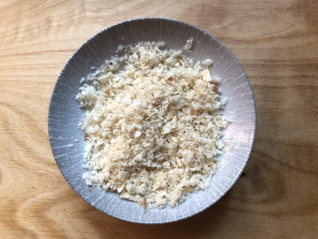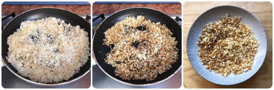 In einer kleinen Pfanne etwas Öl erhitzen und die Brotkrümel darin rösten, bis sie goldbraun und knusprig sind. Dann aus der Pfanne nehmen, um ein Verbrennen zu vermeiden, und beiseitestellen.