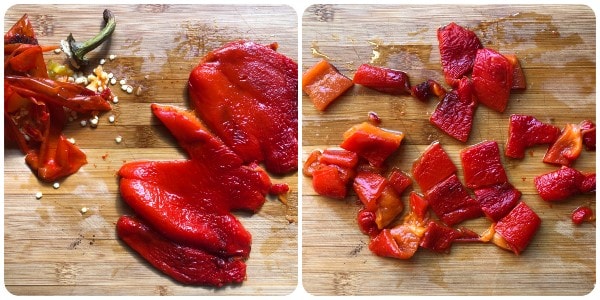 Wenn die Paprika abgekühlt ist, schälen, alle Kerne und weißen Fasern im Inneren entfernen und in Stücke schneiden.