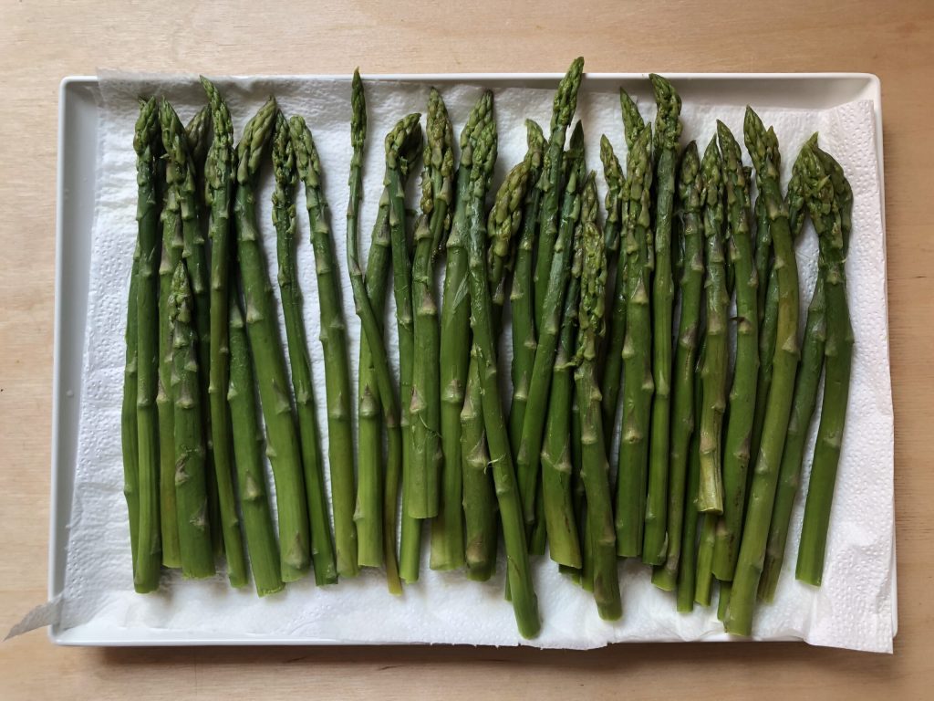 In einem Spargeltopf (oder einem hohen und schmalen Topf) reichlich gesalzenes Wasser zum Kochen bringen. Wenn es kocht, den Spargel hineingeben, die Spitzen heraushalten und mit Deckel kochen, bis sie weich sind. Die Kochzeit kann je nach Größe des Spargels variieren.