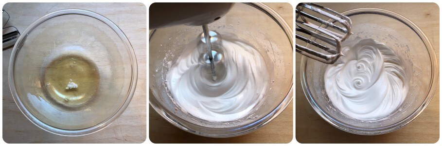 Den Eiweißen eine Prise Weinstein hinzufügen und steif schlagen, dabei nach und nach 40 g Zucker einarbeiten. Beiseite stellen.