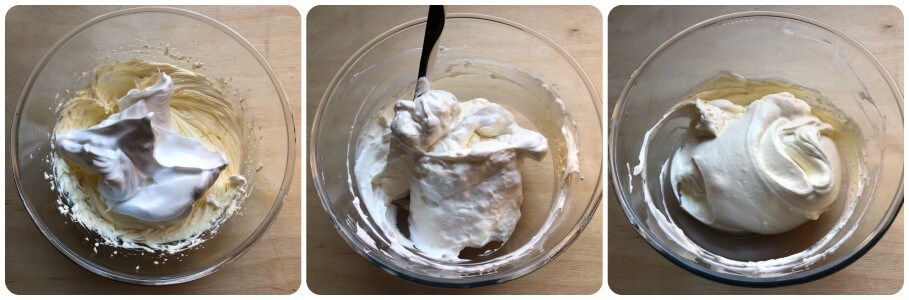 Nun mit einem Spatel die steif geschlagenen Eiweiße vorsichtig unter die Masse heben, indem man sie sanft von unten nach oben einarbeitet.