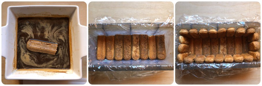 Den Boden und die Seiten der Form mit in Kaffeetauchte Löffelbiskuits auslegen, die auf die Größe zugeschnitten sind.