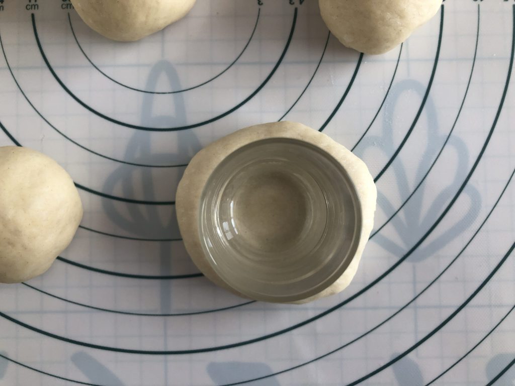 Jede Kugel mit der Handfläche flachdrücken, dann ein Glas in die Mitte drücken, um eine Vertiefung zu formen.