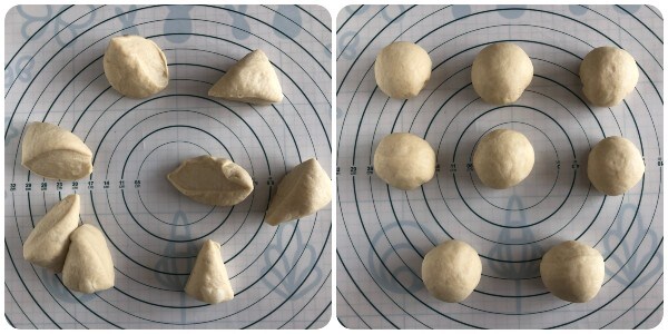 Jede Hälfte des Teigs in acht gleich große Stücke teilen und acht Kugeln formen.