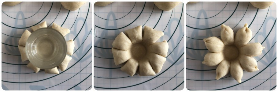 Acht Schnitte im äußeren Teil des Teigs machen, dann das Glas entfernen und jedes „Blütenblatt“ wie auf dem Foto gezeigt zusammendrücken.