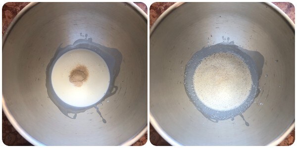 Die warme Sahne in die Schüssel der Küchenmaschine gießen, dann Zucker, Honig und Hefe hinzufügen und mit einem kleinen Schneebesen umrühren.