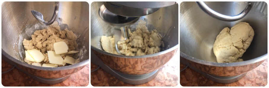 Wenn der Teig eine kompakte Konsistenz erreicht hat, eine Prise Salz und 50 g Butter in Stückchen hinzufügen. Weiter kneten, immer mit dem Haken, bis ein fester und homogener Teig entstanden ist.