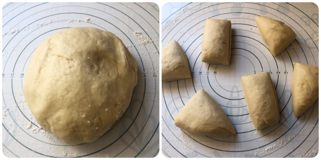 Am Ende dieser ersten Gehzeit den Teig auf die bemehlte Arbeitsfläche geben und in sechs Teile teilen. Es ist nicht schlimm, wenn nicht alle gleich groß sind. Ihr werdet einfach Schnecken in unterschiedlichen Größen erhalten.