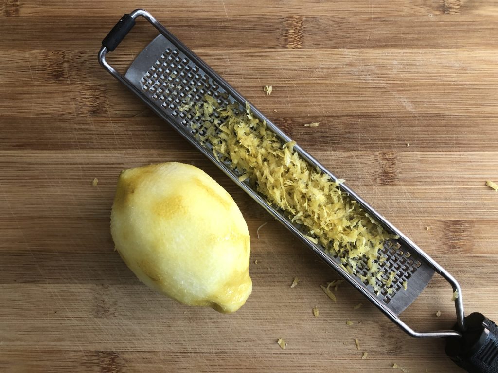 • Die Zitrone gut waschen, trocknen und mit einer Zitronenreibe die Schale abnehmen. Verwenden Sie unbedingt eine unbehandelte Zitrone, da die Schale von normalen Zitronen nicht essbar ist.