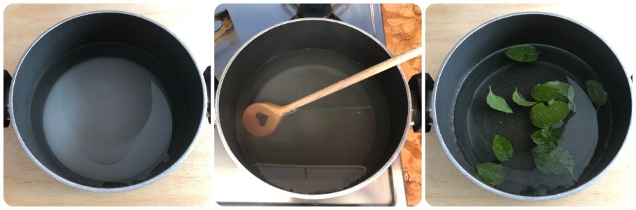 Bei niedriger Hitze erwärmen und rühren, bis sich der Zucker vollständig aufgelöst hat. Dann den Herd ausschalten, ein paar Minzblätter hinzufügen und vollständig abkühlen lassen. Wenn Sie die Zeit verkürzen müssen, gießen Sie die Flüssigkeit in eine Schüssel.
