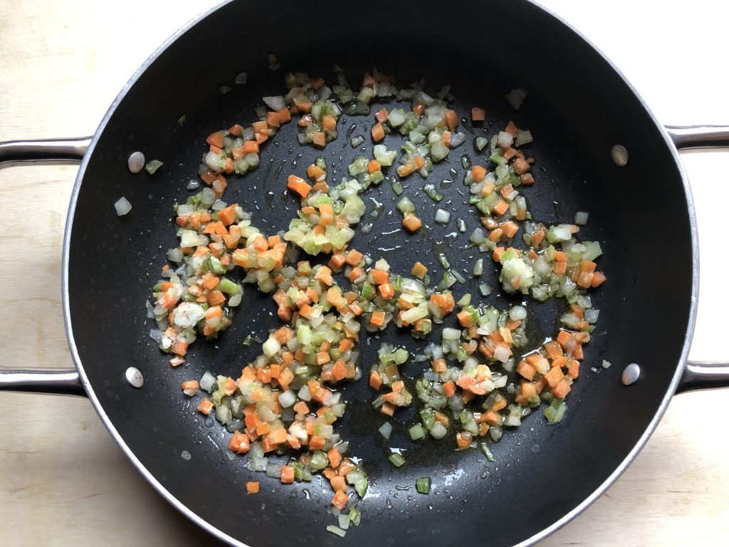 In einer geräumigen Pfanne vier Esslöffel Öl erhitzen, dann die Soffritto-Mischung hinzufügen und bei mittlerer Hitze ein paar Minuten anbraten, dabei oft umrühren.