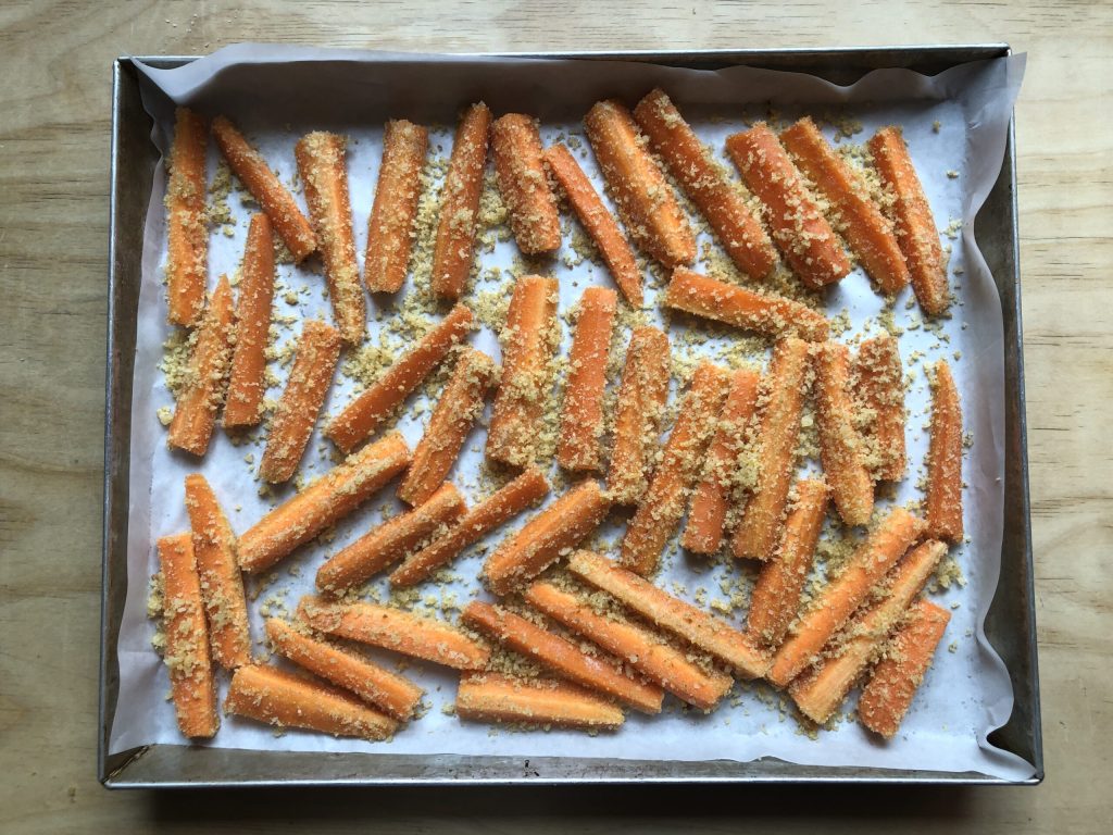 Die Karotten schaben, waschen, mit Küchenpapier abtupfen und in Stifte schneiden.