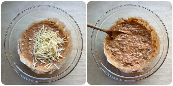 Das Ragout in eine große Schüssel geben, die Béchamelsauce hinzufügen und gut vermischen, um sie perfekt in die Soße zu integrieren.