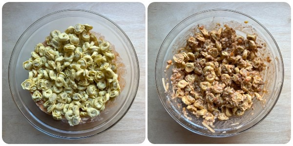 Auch die Tortellini hinzufügen und sie perfekt mit der Mischung vermengen, bis sie vollständig von der Soße bedeckt sind.
