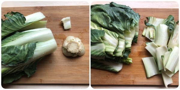 Das Ende des Mangoldkopfes entfernen, alle Blätter abtrennen und gründlich unter fließendem Wasser waschen.