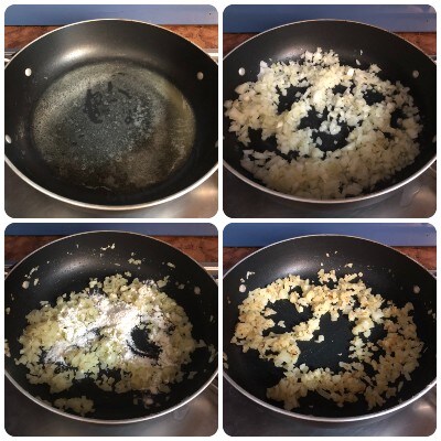In einer Pfanne 25 g Butter schmelzen, dann die gehackte Zwiebel hinzufügen. Anbraten, bis sie leicht goldbraun ist, dann das Mehl dazugeben und kurz anrösten lassen.
